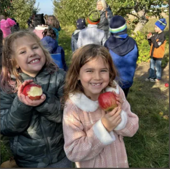 John teaches the children how to pick apples, where to find their seeds and what is involved in growing apples.