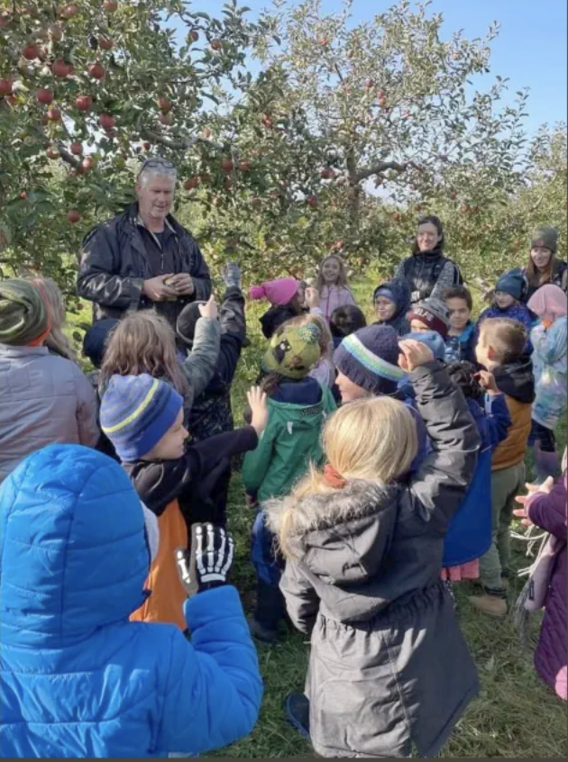 For high school tours John teaches them the economics, sciences, laws, costs, etc. involved in this farming. Students learn a lot and ask a lot of questions. Everyone gets to enjoy an apple and John gets to share the joys of his job.